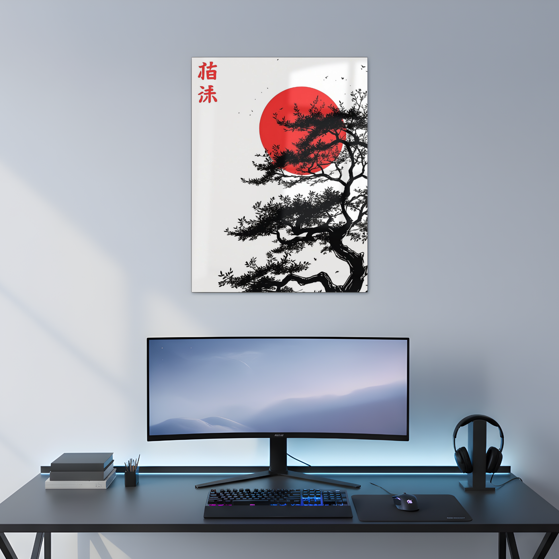 The Ultimate Japanese Red Sun & Bonsai Silhouette Metal Poster for Your Walls