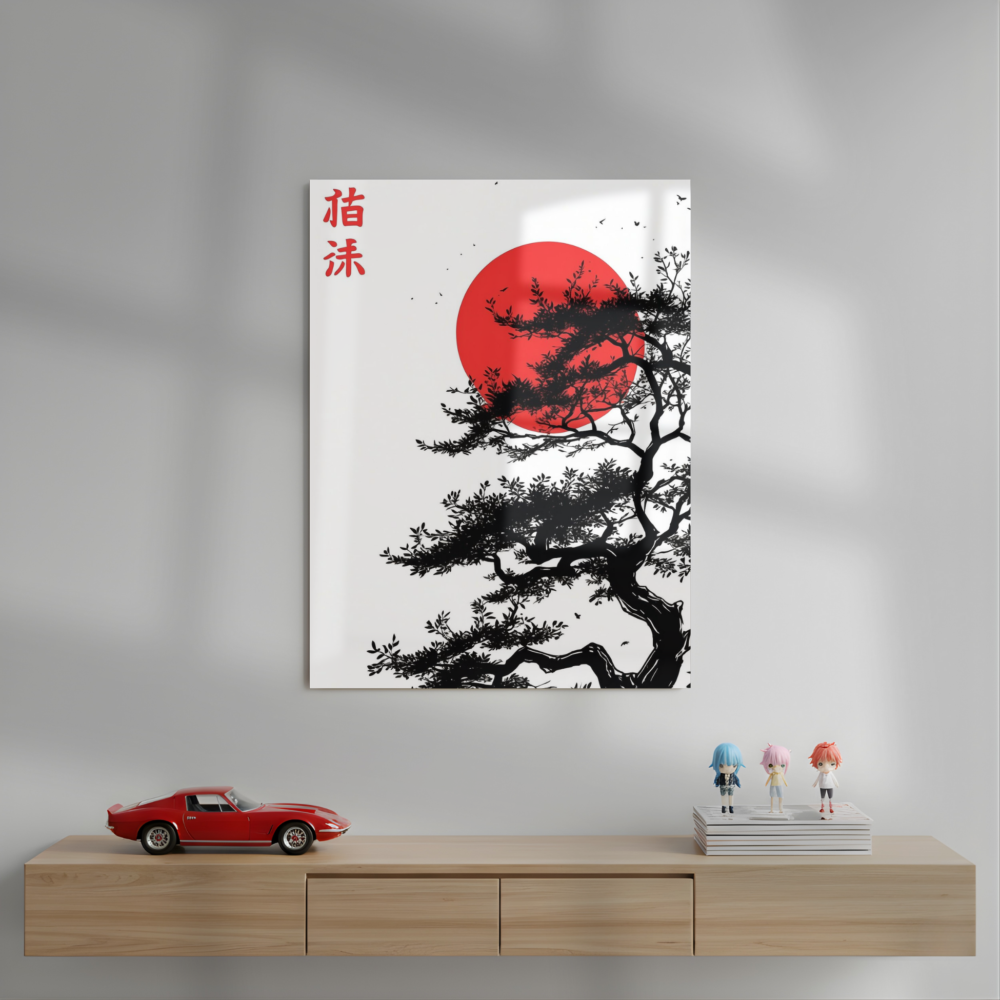 Japanese Red Sun & Bonsai Silhouette Metal Poster | Aesthetic Pop Art Wall Decor & Painting