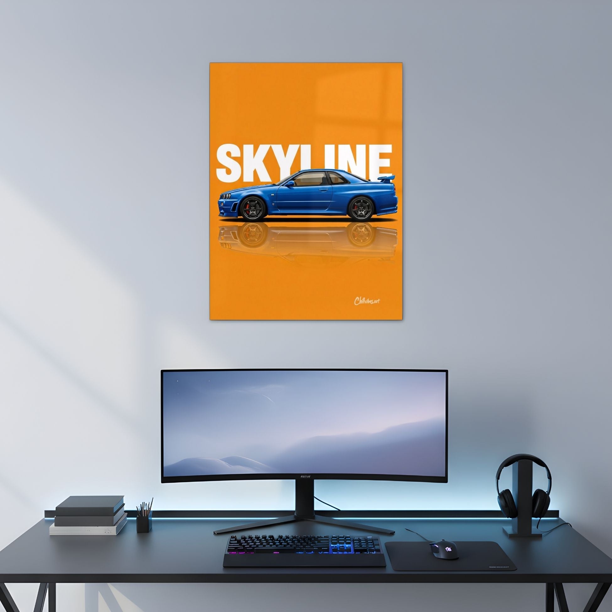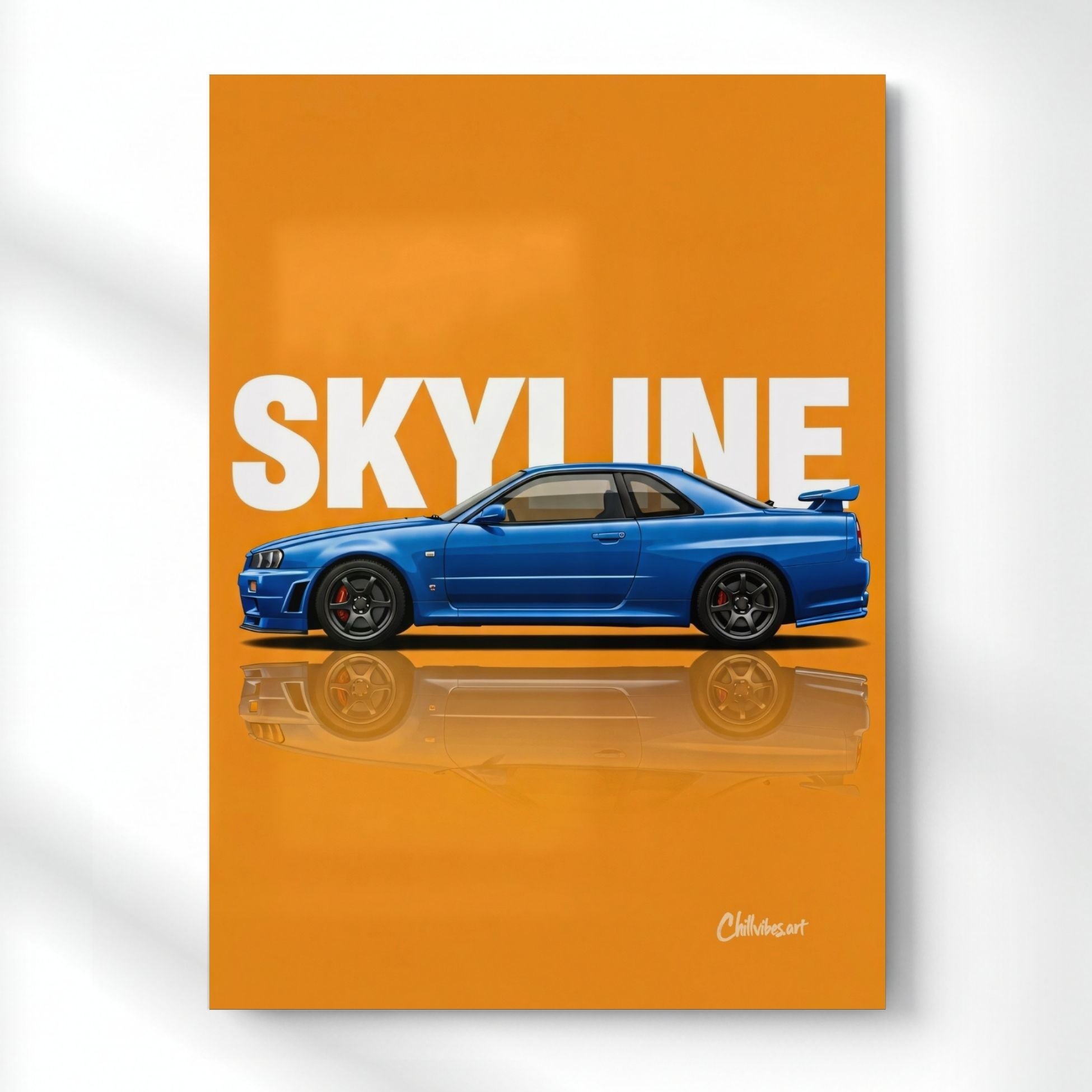 The Ultimate Skyline R34: Blue on Orange Metal Poster for Your Walls