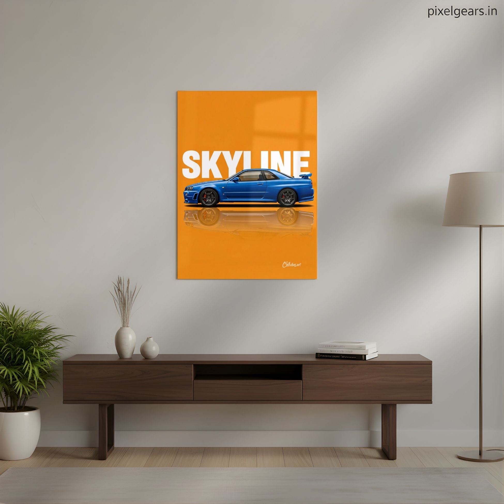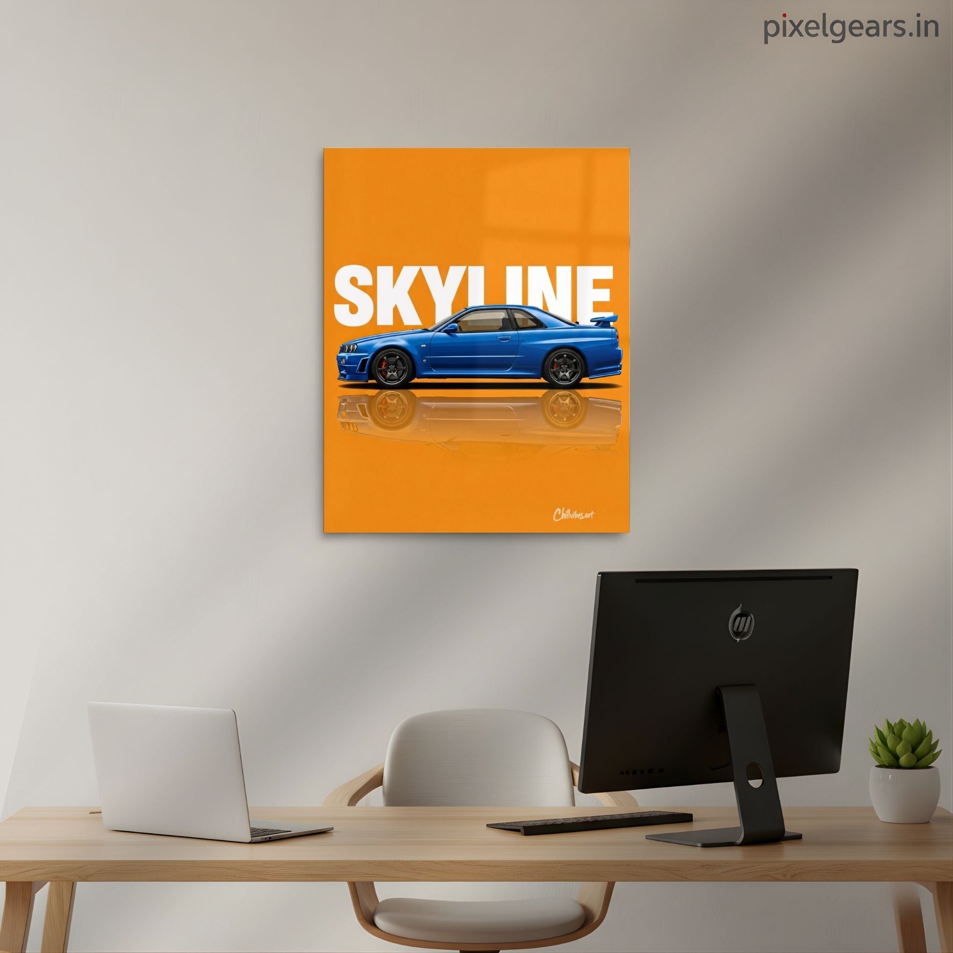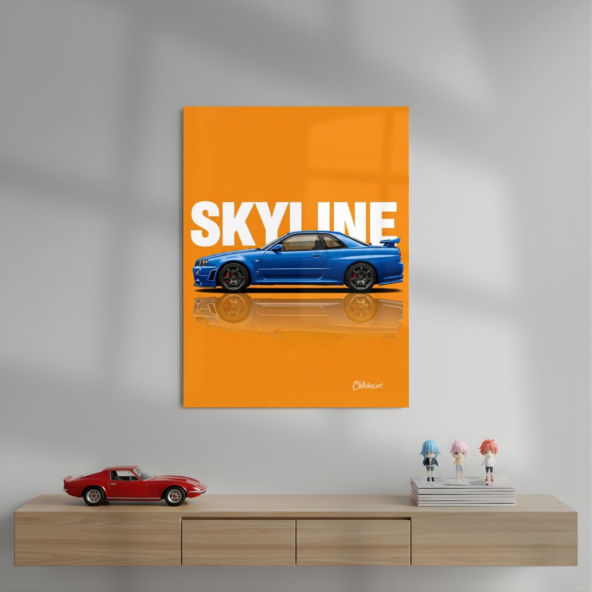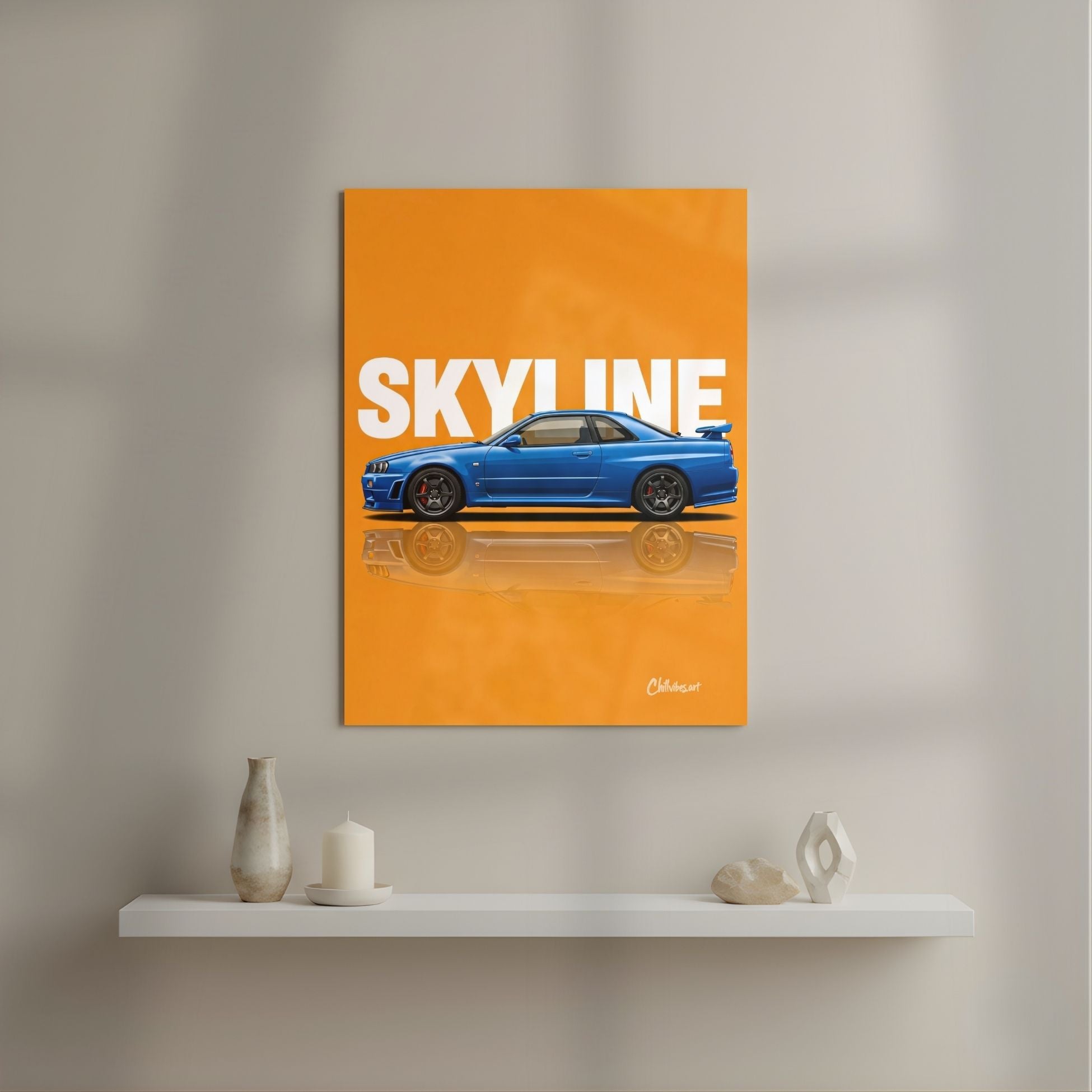 Skyline R34: Blue on Orange Metal Poster | Aesthetic Pop Art Wall Decor & Painting